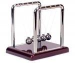 Na podwójnych nitkach wisi rząd pięciu stykających się ze sobą stalowych kulek. Gdy jedną z nich odciągniemy i puścimy, uderzy w pozostałe i na drugim końcu szeregu ostatnia kulka odskoczy prawie o taką samą wysokość, na jaką podnieśliśmy pierwszą. Gdy podniesiemy i puścimy dwie kulki, po zderzeniu z drugiego końca odskoczą dwie.